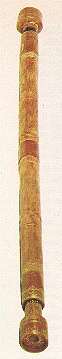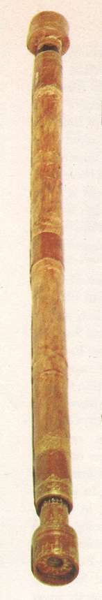 As described by the Museo di Storia della Scienza, this is a tube made of two hemicylinderical pieces of wood held together by copper wire, the whole covered with paper. Construction is attributed to Galileo, circa 1610.